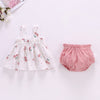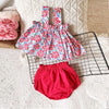 סט הכולל חולצה וזוג מכנסיים קצרים מאריג אוורירי. חולצה עם שרוולי פרפר ומפתח צוואר מרובע עם גומי בחזית ובגב. מכנסיים קצרים עם גומי במותן.